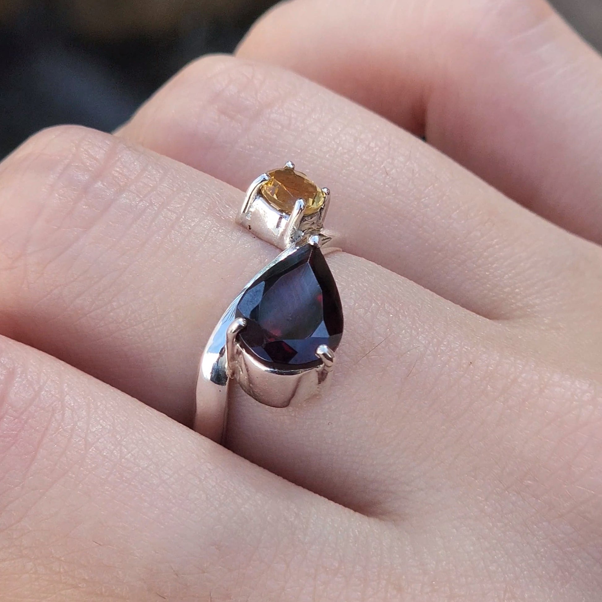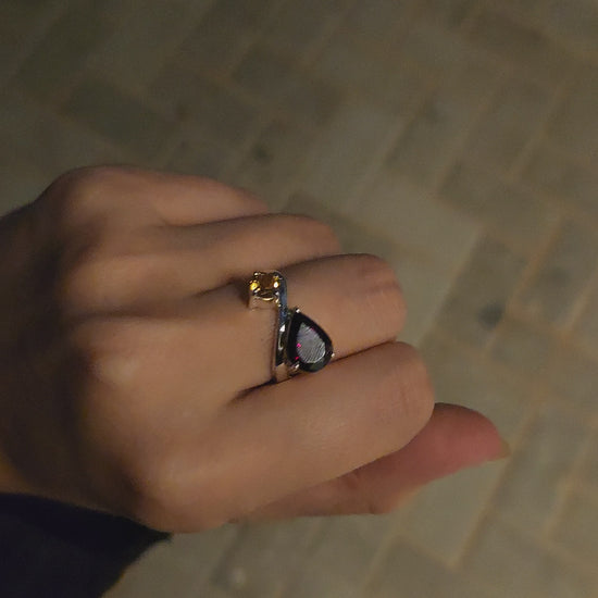 Named Wahaj, an Arabic word meaning a deep, living radiance, this ring embodies the harmony of inner fire and golden light. A richly hued garnet anchors the design with depth and intensity, while luminous citrine brings warmth, clarity, and glow.